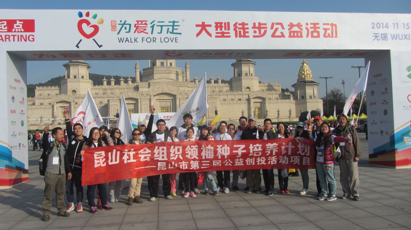 昆山市乐仁公益发展中心在昆山市第三届公益创投项目——昆山市社会组织领袖种子培养计划项目的支持下组织昆山市义工联、昆山市老来伴居家养老服务社、昆山市德馨青少年服务中心、昆山市自强社会服务社、昆山市乐益新昆山人服务中心5家社会组织共22人组成了5支队伍,并携昆山市义工联 “爱惜相伴 青苗茁壮”项目参与了本次为爱行走实战筹资活动。