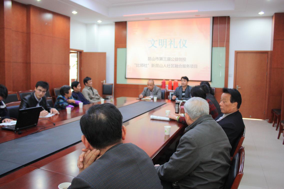 2015年3月14日下午,,由昆山市公益创投活动支持的获选项目“比邻社——新昆山人社区融合服务项目”之文明礼仪课堂在集善社区一楼会议室开展。该系列每月一次的文明礼仪课堂活动旨在加快新昆山人融入本地生活的速度,增加新昆山人对社区的归属感,鼓励新昆山人积极参与社区事务。