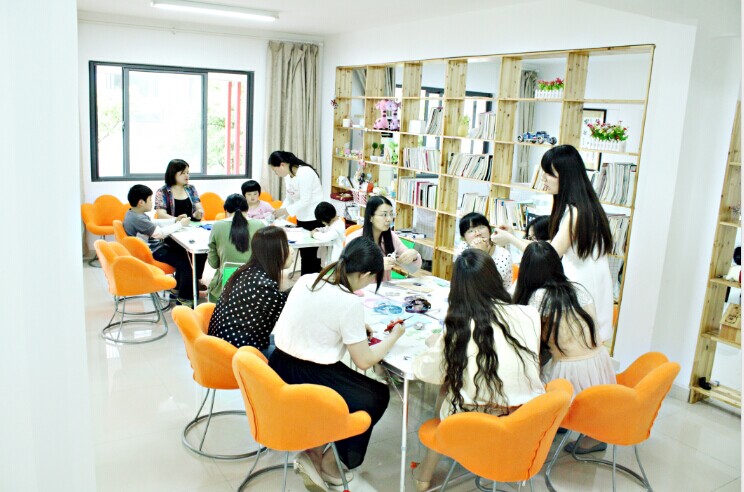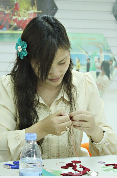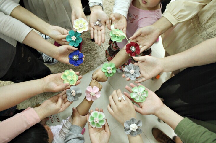 好像说起来挺容易的,其实操作中还是遇到了很多小问题,有的同学不会巧用剪刀,剪不出想要的弧形,剪的大小也不一样,比较沮丧,秋秋老师鼓励大家,第一次都这样的,一次操作就做得很完美是很难很难,同学们享受自己动手的过程比结果更加重要。带着这样的鼓励,大家积极的投入到了继续制作当中,在秋秋老师的帮助下,同学们从剪模型,大花瓣,小花瓣,缝合,串联,慢慢成六朵花型,一步一步,有条不紊的进行着,脸上洋溢着期待又幸福的笑容,现在到了粘贴水钻的过程,在这个环节中,需要用到胶枪,在高温加热下固体融化,滴在毛毡上,然后迅速的放上水钻,就粘好了,大家基本上都在同一时间段完成了自己的第一次手工花,纷纷的拍照留念,红的,粉的,绿的,蓝的,大的,小的,圆弧的,方形的,菱形的,美丽极了。