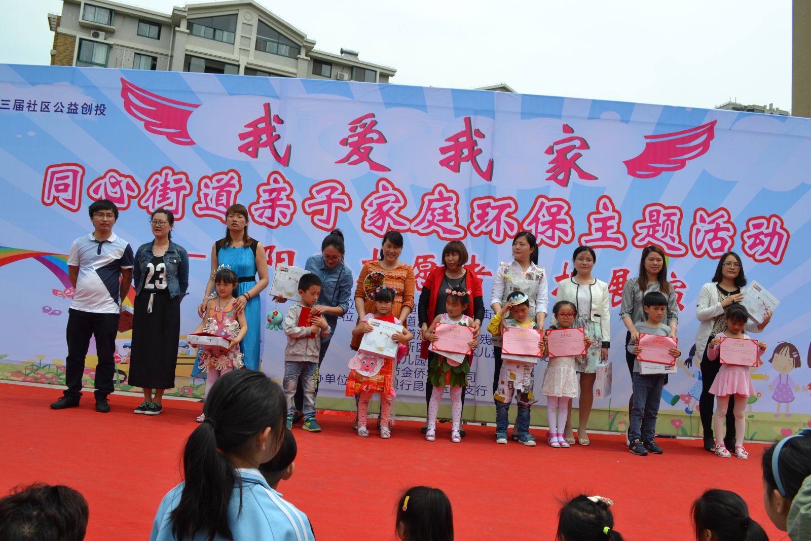 2015年5月16日上午,由昆山市公益创投活动支持的“同心街道阳光儿童家园综合打造计划 ”项目亲子家庭主题活动在清水港社区倾城之恋广场如期举行,该亲子家庭户外活动旨在通过服务对象们分享和融入的过程中,丰富以家庭为单位的社区文化生活。本次活动的主题是“我爱我家”同心街道亲子家庭环保主题活动暨阳光志愿者汇报展演,本次活动我们得到了清水港街道和社区的大力支持,同时也得到了江苏银行的赞助,为我们的活动添上了有力的一笔。