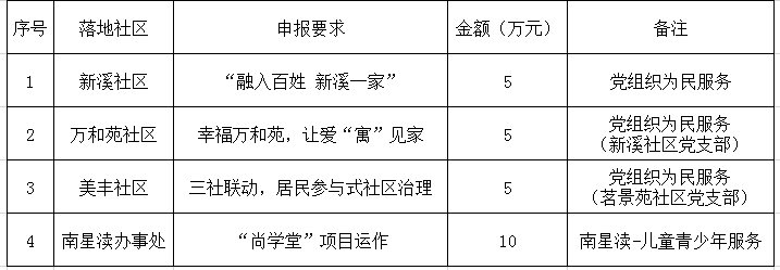 一、活动背景 昆山高新区社会事业局、昆山高新区南星渎办事处联合出资135万元资金,发起第三届微创投活动。昆山高新区第三届微创投活动委托第三方组织昆山市爱德社会组织培育中心承办,负责整个项目运营管理。截止2020.6.15,共征集到37个项目,结合专家在线评审打分以及主办方的意见,确定25个合格项目书进入现场评审。其中有4个项目未征集到合适的社会组织,现在进行补征集。 二、活动主题 第三届微创投主题为“联动共治·善创家园”;旨在突出昆山高新区经济社会发展的特色,倡导善治的理念,培育公益力量,整合公益资源,引导社会组织精准定位高新区的村和社区急需的公共服务,尤其是公益服务相对落后的村,通过公益微创投项目,带动村/社区工作者、村民/社区居民等力量共同参与高新区社区治理与发展,打造高新区现代、公益、参与式治理的社区氛围。 三、活动目标 (一)提高公益服务覆盖范围,重点提高高新区各村公益服务水平和公益组织数量; (二)满足昆山高新区社区居民日益增长的社会服务需求与政府转移职能工作需要; (三)激发与带动本地公益力量成长,推动高新区社会服务发展,探索高新区社区治理与发展模式; (四)打造社区自治氛围,推动高新区进入新时代善创社区。 四、申报条件 (一)申报主体 1.在昆山市民政部门正式登记的社会组织;申报组织正常年检通过,新成立组织除外。项目执行团队具有稳定负责人、具备较强公益心、认真好学,执行团队成员较稳定。 2.在昆山高新区备案的社会组织。核心负责人能带领团队带动社区居民参与社区公益服务活动。项目执行团队可以与社区居委会互动合作。 3.申报组织无重大违纪记录。 4.每家组织最多申报2 个项目。 (二)申报要求 1.项目须落地在昆山高新区辖区。 2.项目满足社区/村居民服务需求,服务内容明确。 3.项目须具有广泛的参与性,带动社区/村居民参与公益。 4.项目预算:预算具体、合理。 5.项目周期 12 个月。 6.登记注册组织申报项目落地社区须是未有政府购买服务覆盖的社区/村。