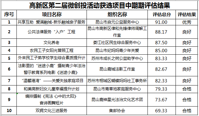 昆山高新区第二届公益微创投中期评估结果公告2019-07-24 09:46:052019年7月11日,在昆山高新区善创公益发展中心善创坊,举行了昆山高新区第二届公益微创投中期评估活动。主办方代表昆山高新区社会事业局副局长陈雷东、昆山高新区社会事业局民政科副科长李亚、评估专家苏州科技大学王春老师、承办方代表昆山爱德主任沈淑珍、财务专家唐洁、各项目的落地方代表以及10个项目负责人及团队成员等参加了此次评估活动。 此次中期评估根据项目实施、项目投入、项目成效、团队能力建设、项目总结推广、财务管理六个方面进行评估,希望以此促进各项目有效实施、社会组织能力成长、公益资源高效运用为宗旨,总结项目前期的活动成果,以提升参与社会组织的内部治理能力,项目的管理能力,服务的专业力。下面是各项目中期评估的结果: